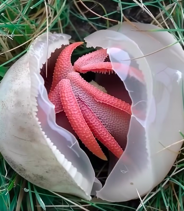 According to what I read, this bizarre species originally comes from Australia and Tasmania. It starts off looking like a strange white egg before splitting open to reveal long, red, tentacle-like “fingers” that stretch outward. To attract flies, it releases a stench of rotting flesh — a clever, if disgusting, way for the fungus to spread its spores. The flies, fooled by the smell, land on the sticky surface and carry the spores elsewhere.