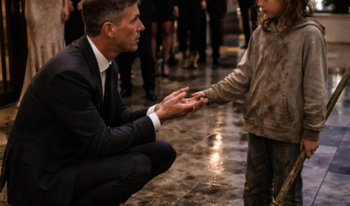 The Billionaire Host Froze Mid-Speech at His Own Rooftop Gala — “Wait… That Can’t Be,” Julian Whispered, Lowering the Microphone as His Eyes Locked on a Small Girl Outside in the Rain, But the Moment He Took Her Hand and Saw the Mark on Her Palm, He Dropped to His Knees as the Entire Crowd Fell Silent and the Truth Changed Everything